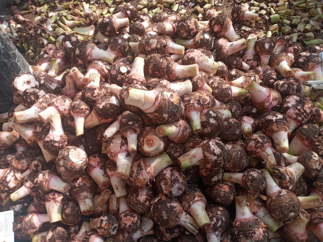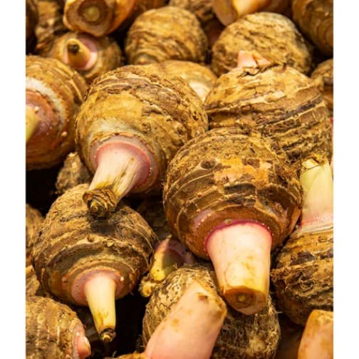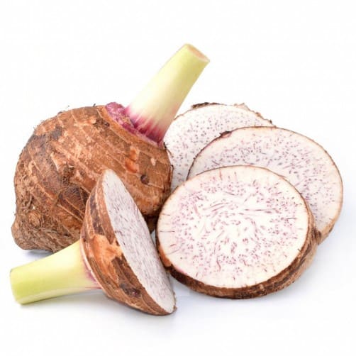 Taro with brown, scaly and sort of hairy skin and typically a creamy-white interior flecked with purple The shelf life is long and it can be stocked for up to 9 months